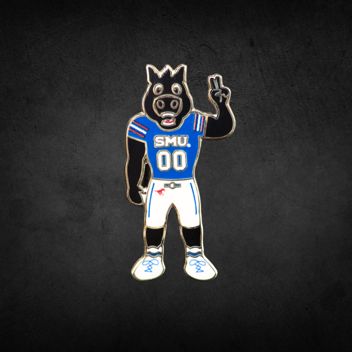 This unique lapel pin showcases Peruna, SMU’s legendary black stallion mascot, suited up in full game-day gear, ready to charge down the field. Peruna is decked out in a classic SMU jersey, with intricate detailing that brings his fierce spirit to life.