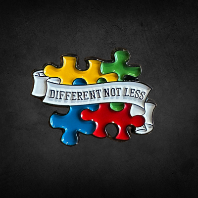 • “Different Not Less” Pin – Four colorful puzzle pieces with a banner message that reinforces the truth that being different is something to celebrate—not diminish.
