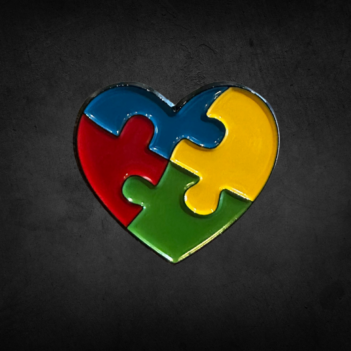• Heart Puzzle Pin – A beautiful, heart-shaped design with multicolored puzzle pieces that symbolize unity, love, and the beauty of every mind on the spectrum.